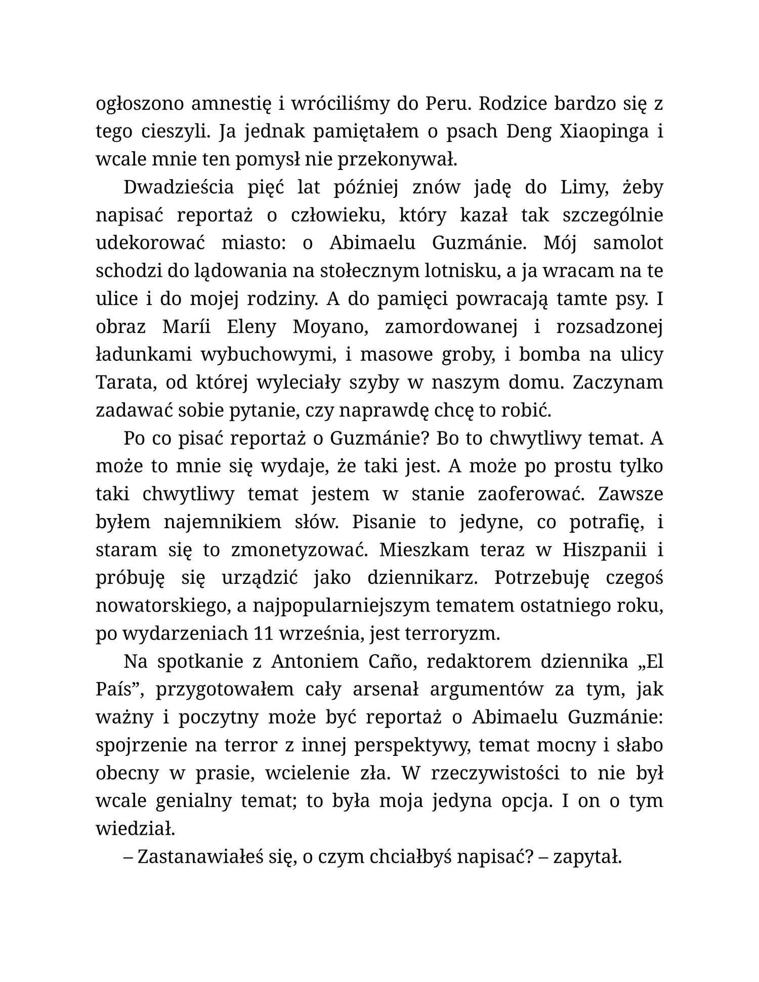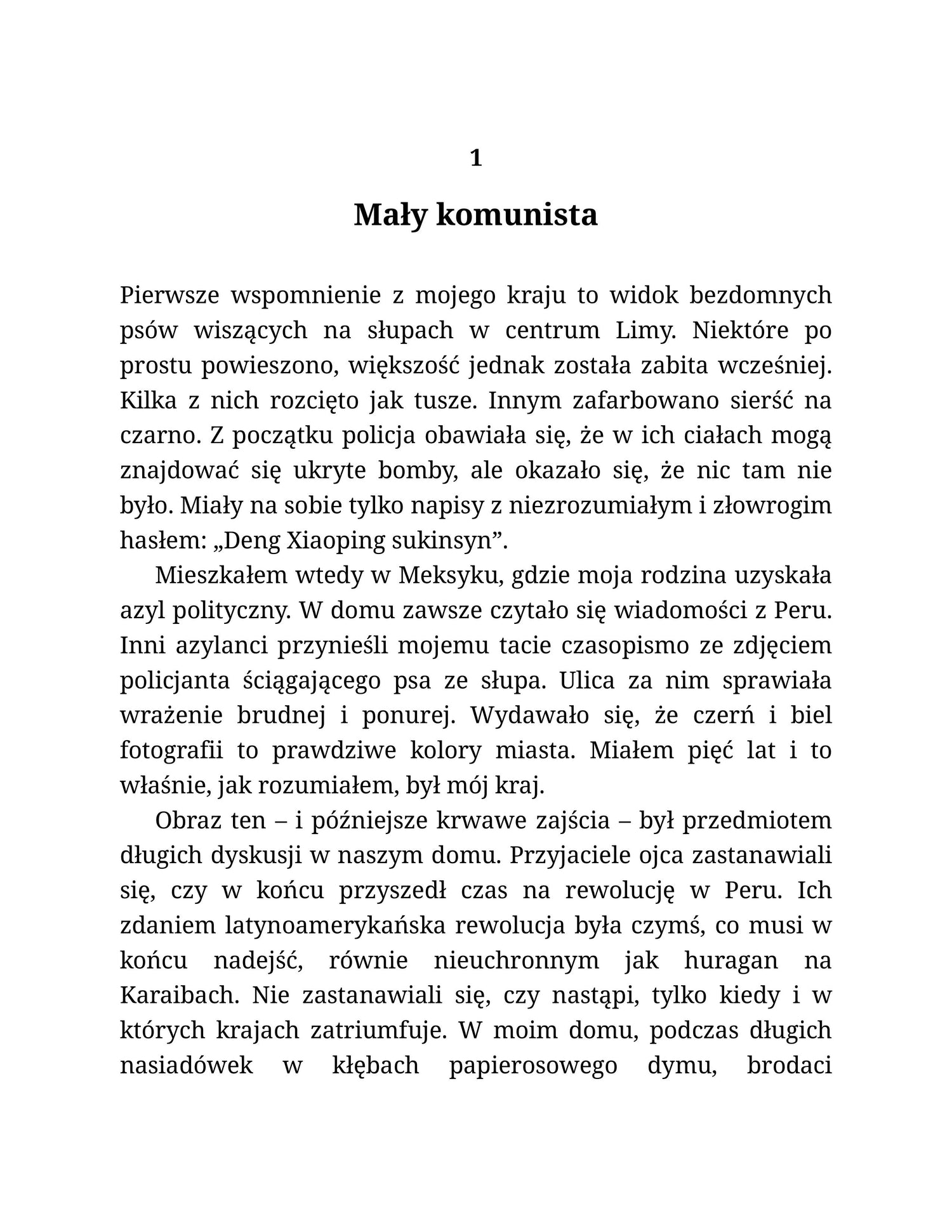 Dwie ostatnie dekady XX wieku to w Peru czas dramatycznego konfliktu, który tak naprawdę nazwać należy wojną domową. Z jednej strony Świetlisty Szlak, maoistyczna organizacja, która postanowiła podpalić kraj, przeorać społeczeństwo i bez oglądania się na ofiary wprowadzić nowy ład. Z drugiej państwo, które najpierw nie umiało rozpoznać zagrożenia, a potem odpowiedziało na nie terroryzmem. Efekt: około 70 tysięcy ofiar, głównie mieszkańców Andów, za które odpowiedzialność spada niemal po równo na wywrotowców i służby mundurowe.