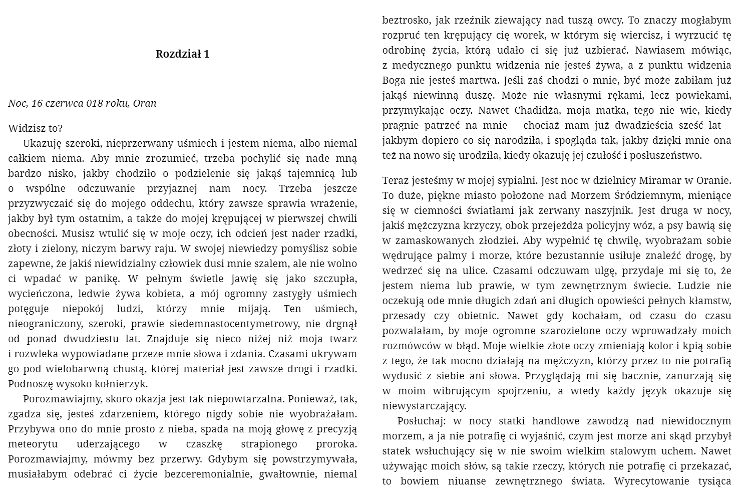 Aube musi zmierzyć się z pamięcią o algierskiej wojnie o niepodległość, której nie doświadczyła, i zapomnieć o wojnie domowej z lat dziewięćdziesiątych XX wieku, której padła ofiarą. Młoda dziewczyna, prowadząca zakład fryzjerski w Oranie, nosi w sobie brzemię dławionej i wypieranej pamięci zbiorowej. Tragiczne wydarzenia odcisnęły trwały ślad na jej ciele i zdrowiu – ma bliznę na szyi i zniszczone struny głosowe.