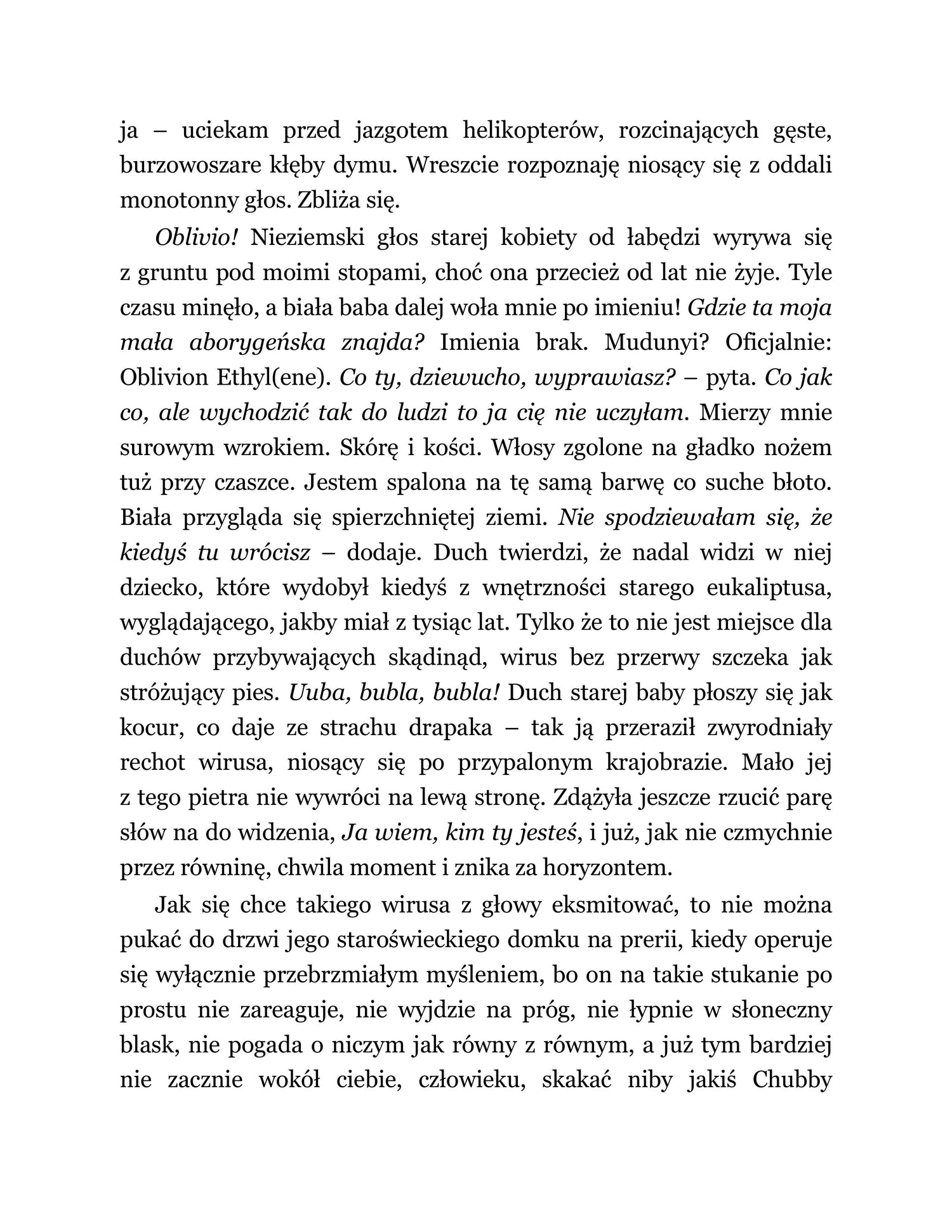 Australia, niedaleka przyszłość. Ludność aborygeńska wciąż żyje głównie na kontrolowanym przez rząd wycinku Terytorium Północnego, a środowisko naturalne uległo nieodwracalnym spustoszeniom z powodu zmiany klimatycznej. Pochodząca z wysiedlonej społeczności Oblivia, niema nastolatka, ofiara gwałtu grupowego z rąk nawąchanych benzyny nastolatków, mieszka w jednej z niezliczonych rdzewiejących łodzi na bagnie, które miejscowi dzielą z tysiącami czarnych łabędzi, zmuszonych do przeniesienia się tu z innych części kraju. Opowieść prowadzi nas przez życie Oblivii, aż po małżeństwo z Warrenem Finchem, pierwszym aborygeńskim prezydentem Australii, i wyniesienie do godności pierwszej damy, uwięzionej w podtopionym, osuwającym się w bezprawie mieście na południu kraju.