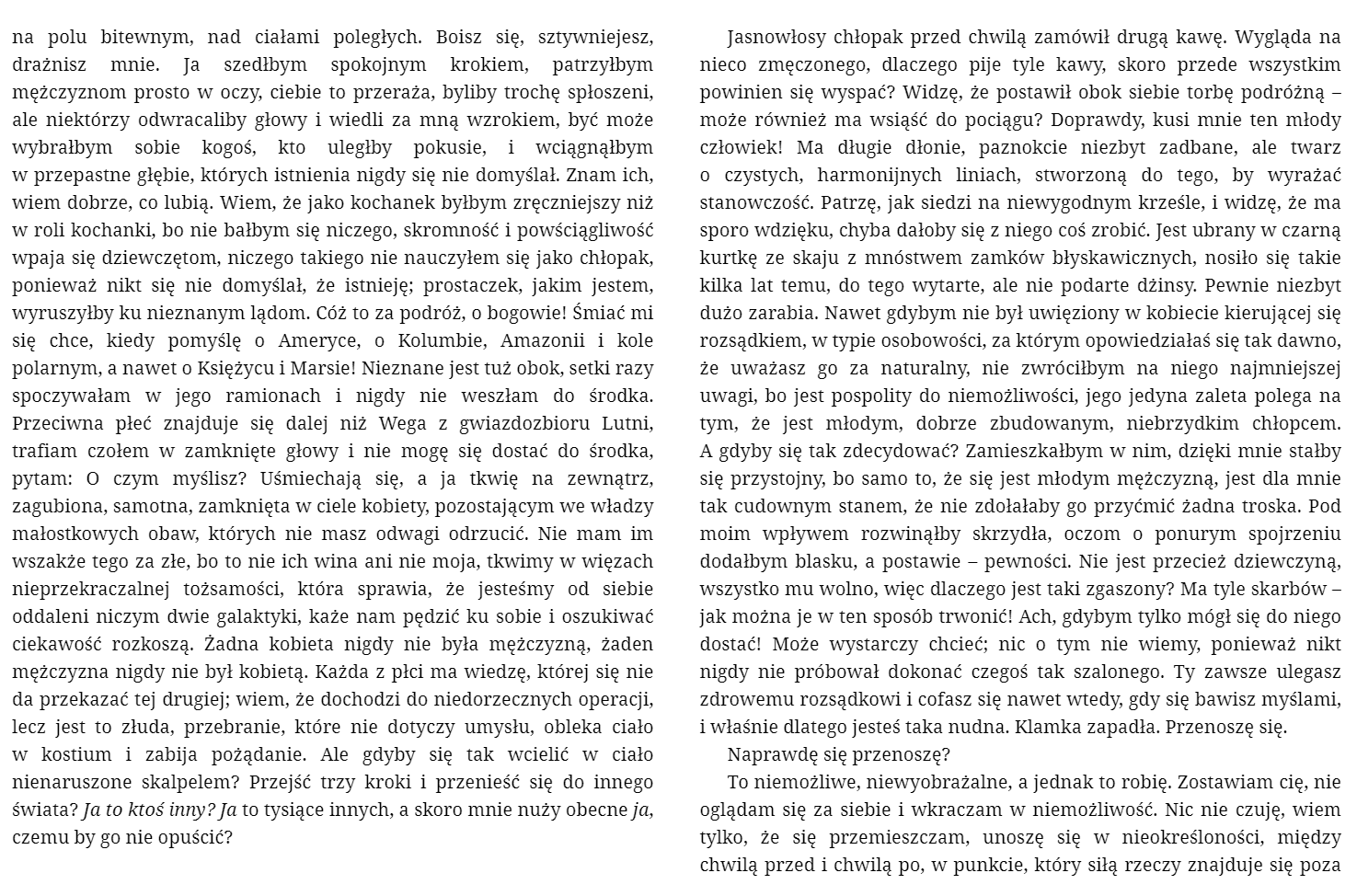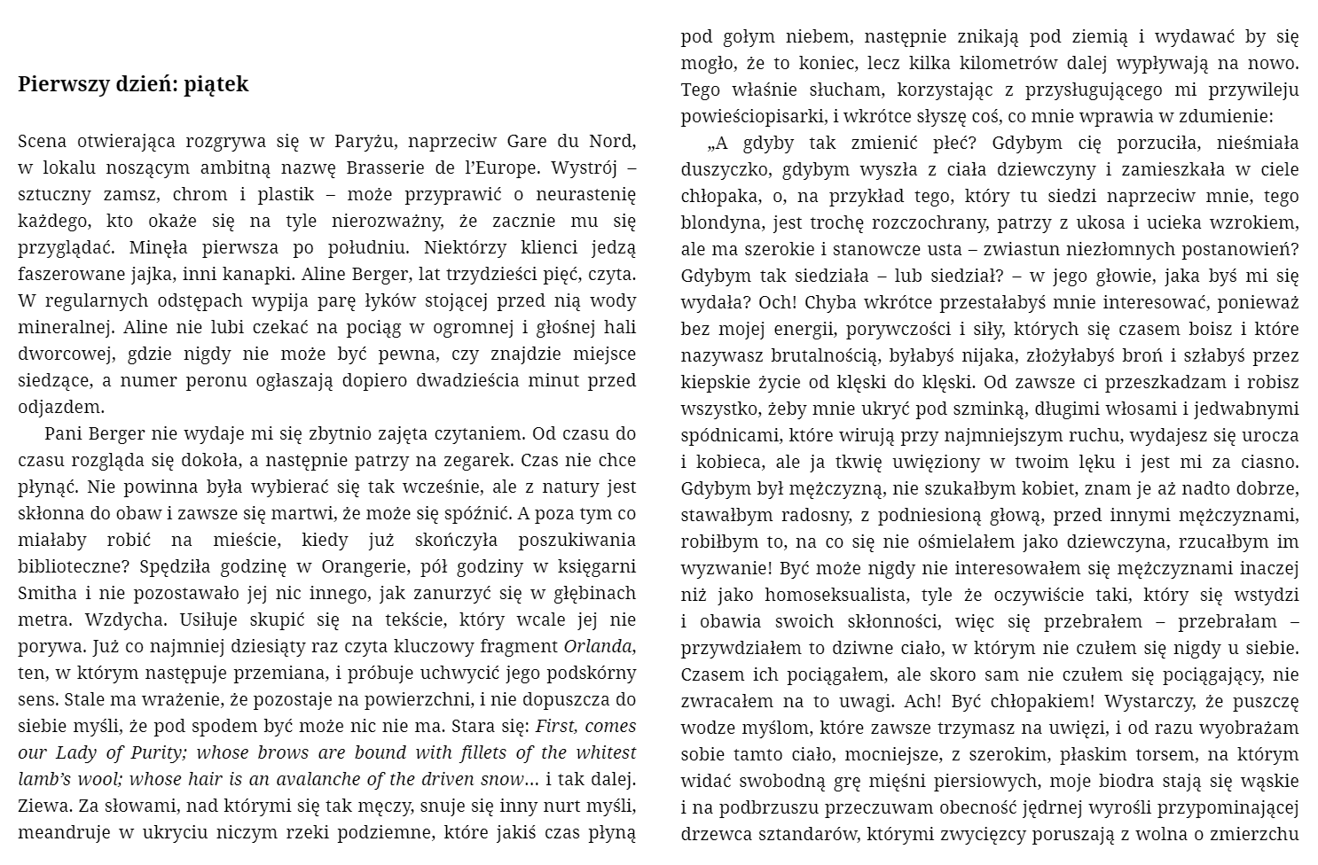Stać się kimś innym. Przybrać inną tożsamość, znaleźć się w innym ciele, przeżywać to, co niedostępne, realizować zakazane namiętności – jak świat światem, każdy snuje takie marzenia. Aline, trzydziestopięcioletniej wykładowczyni literatury wiodącej bardzo – wręcz za bardzo – poukładane życie, zdarzyło się o tym pomyśleć, kiedy na jej drodze stanął przystojny jasnowłosy chłopak. Wówczas wydarzyło się coś niemożliwego: męska część duszy Aline opuściła jej kobiece ciało i przeniosła się do ciała młodego człowieka. Odtąd jest on jednocześnie Lucienem i Aline, czyli Orlandą.