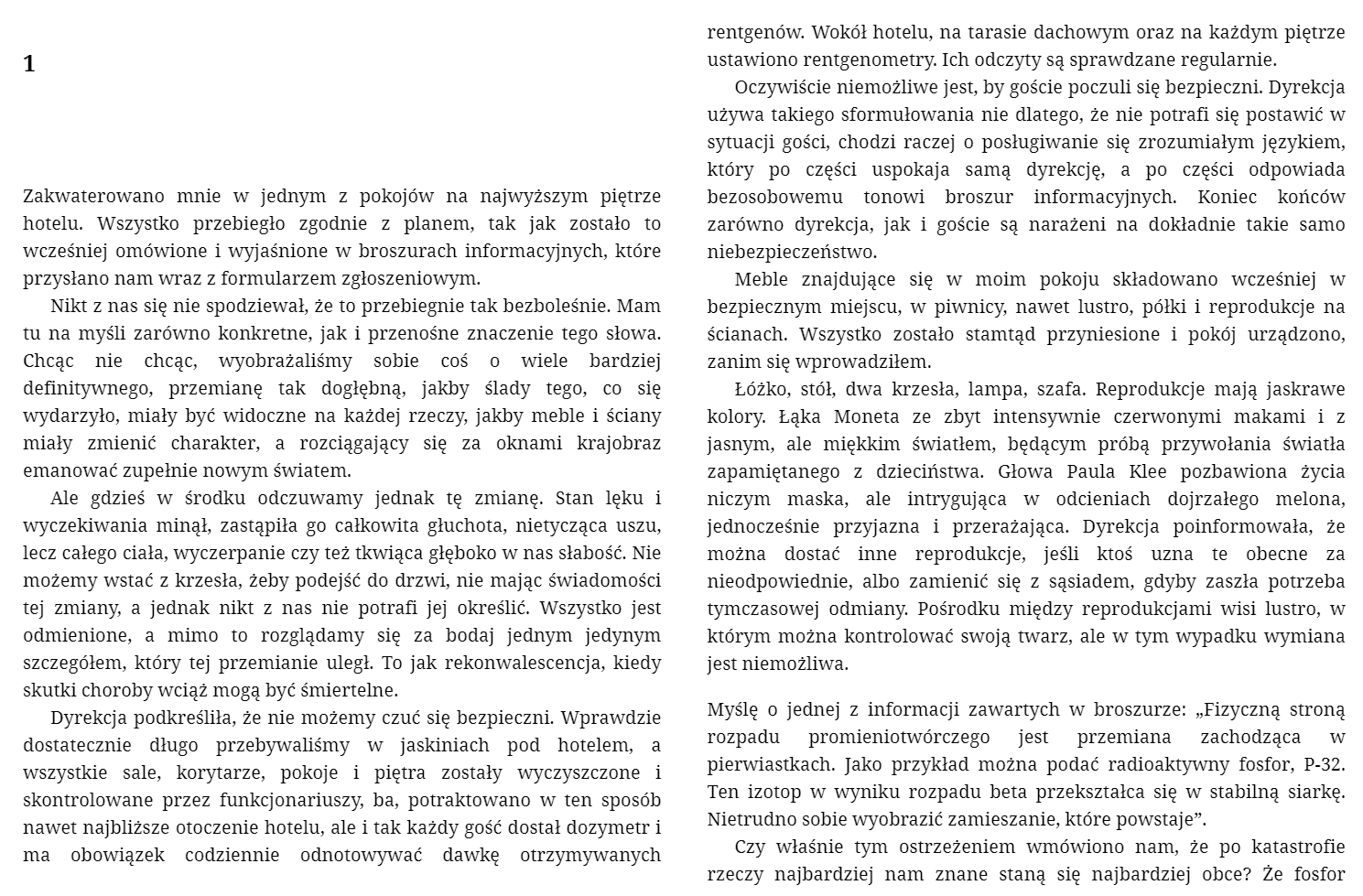 Ale choć goście przetrwali nuklearną apokalipsę, to dopiero początek ich problemów. Hotelowe władze zaczynają cenzurować informacje, a niepokorne jednostki się ucisza. Początkowa otwartość wobec obcych ustępuje miejsca paranoi. Brakuje miejsca, zapasów i zaufania. Gdy za ogrodzeniem pojawia się coraz więcej zdesperowanych ocalałych, goście stają przed pytaniem, czy możliwe jest stworzenie nowego kodeksu etycznego po końcu starego – czy raczej w początkach nowego – świata.